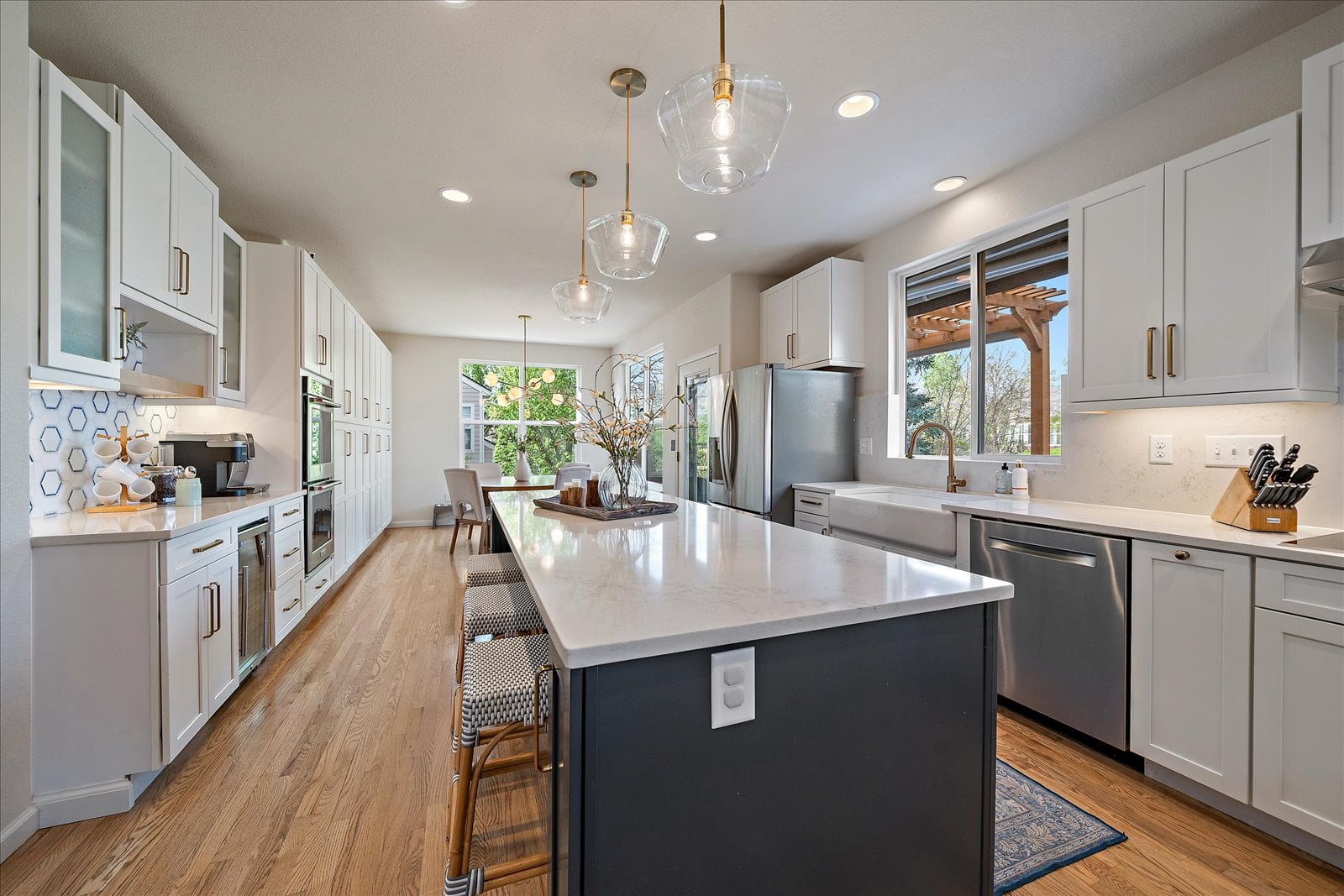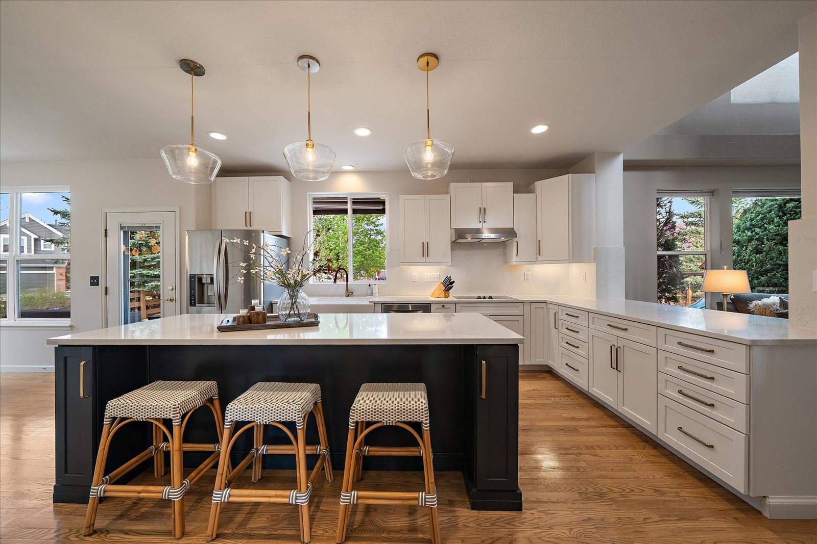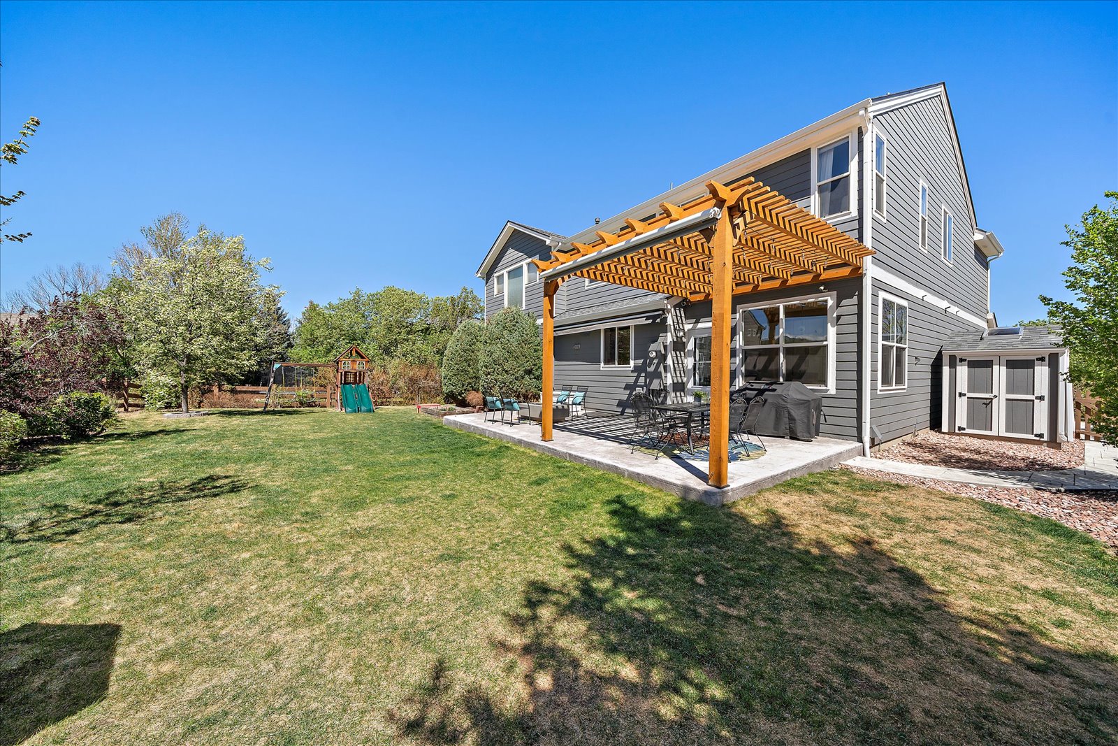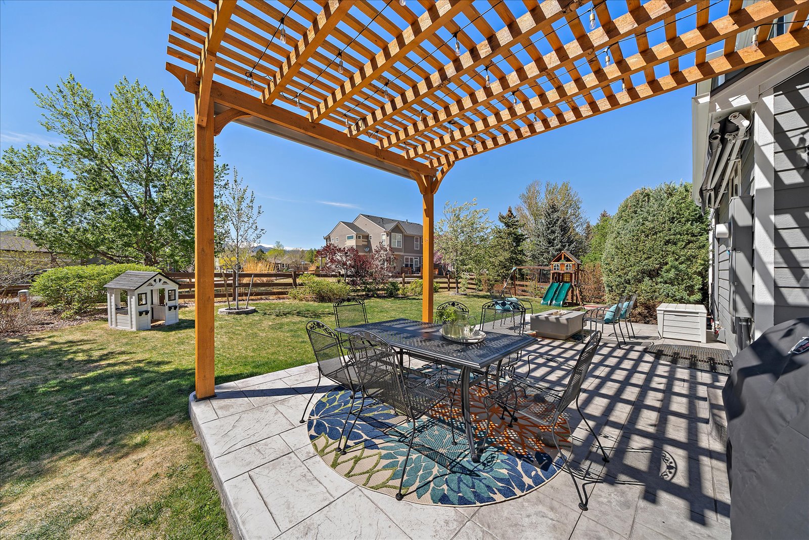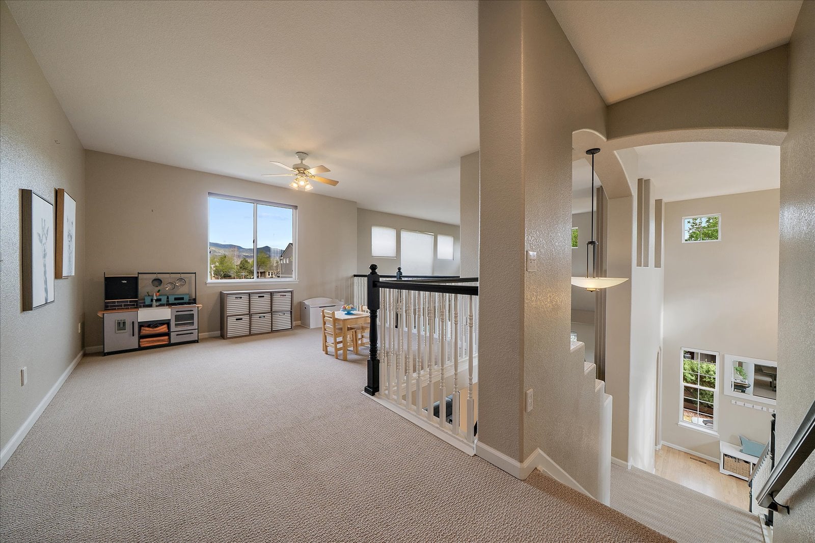 Experience incomparable living in West Arvada’s coveted Fieldstone neighborhood and come home to awe-inspiring Front Range vistas and unobstructed views of North Table Mountain! From the welcoming covered front porch and beyond, this beautifully maintained home offers the perfect spaces for nearly year-round outdoor living + an expansive interior made for entertaining. The main level great room showcases a stunning new chef’s kitchen featuring a bevy of functional & fashionable cabinetry with pull outs & soft close drawers + Caesarstone countertops, farmhouse sink, designer light fixtures & hardware + upgraded appliances including dual ovens and bev fridge in the built-in coffee/dry bar area + an impressive wall of built-in pantry storage in the breakfast nook space. You’ll find gleaming hardwood floors + brand new upgraded carpeting on both upper levels. Natural light floods the interior through walls of windows and the main floor vaulted family room adds a gas fireplace and room for the entire family to enjoy game night. Hosting is a breeze with the well-appointed formal living and dining areas. Main floor also adds guest/powder bath + upgraded laundry/mud room off the 3 CAR tandem garage. Upstairs you’ll find a sunlit loft space perfect for a playroom, study or media room + two secondary bedrooms with ample closet space and a shared full bath with dual vanity. The luxurious primary suite enjoys those North Table views and features a five piece bath + large walk in closet. The finished basement adds a 4th conforming bedroom with adjacent full bath, additional family room/game room space + gym/study area and unfinished storage area. The fully fenced spacious backyard is equal parts private and welcoming and adds a stamped concrete patio with pergola, sun shades, mature trees, and, yes, more views! 3 car garage + newer storage shed add plenty of gear storage options. Easy access to miles of trails, open space and parks. Perfect proximity to Golden, Boulder and Metro Denver. This home truly embraces the best Colorado has to offer with its combination of amenities and location!