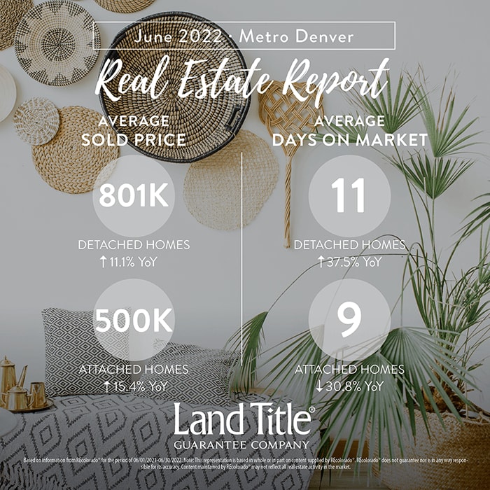 Denver real estate in June saw an increase in active inventory for both detached and attached homes, with a total of 5,678 homes on the market – a jump of 47.48% when compared to last month! This is welcome news for Denver Metro home buyers who have been struggling to find a home due to the sheer amount people competing for record-low inventory the past few years. Pending listings and solds were down when compared to last month, and we saw an increase in the number of days on market to 10 days. These changes are impacting both detached and attached properties, and are likely due to recent increases in mortgage rates and economic news.